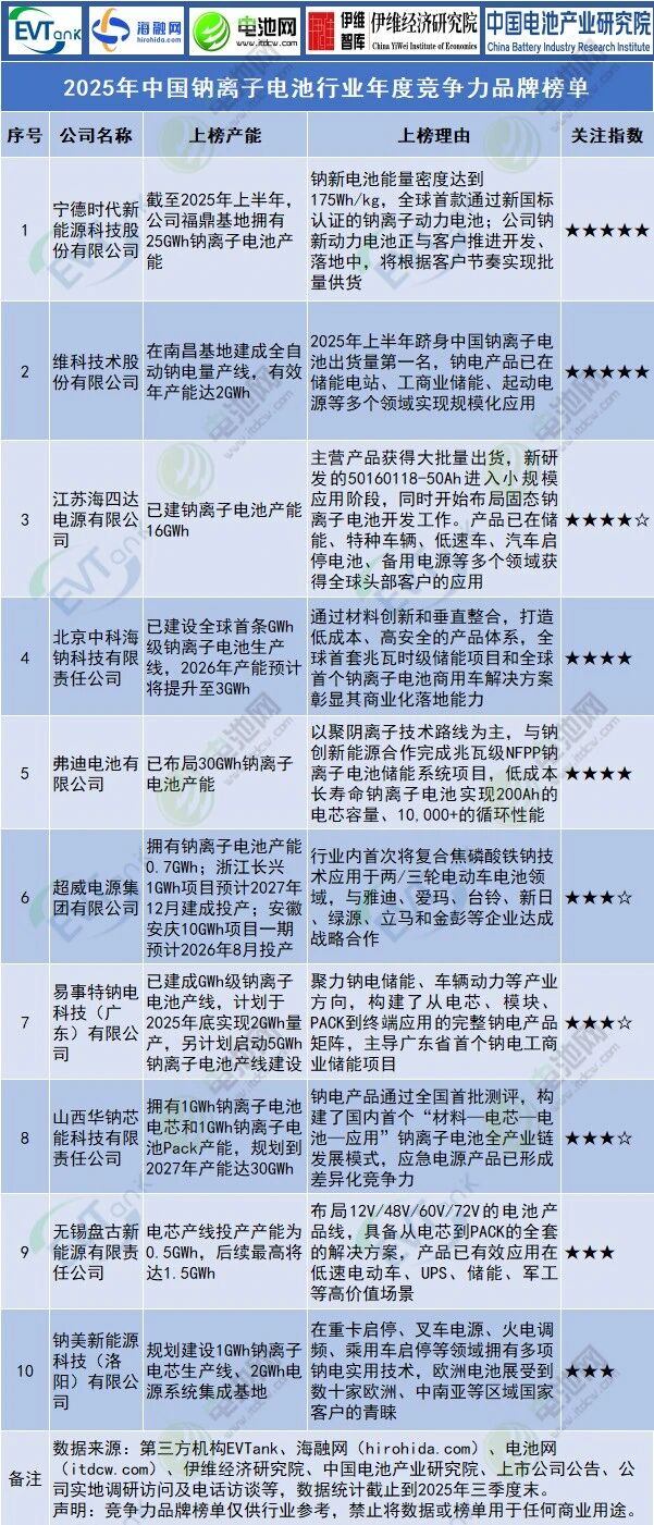 在钠离子电池领域,维科技术股份有限公司凭借强大的综合实力,荣列“2025年中国钠离子电池行业年度竞争力品牌”第二位,仅次于宁德时代。